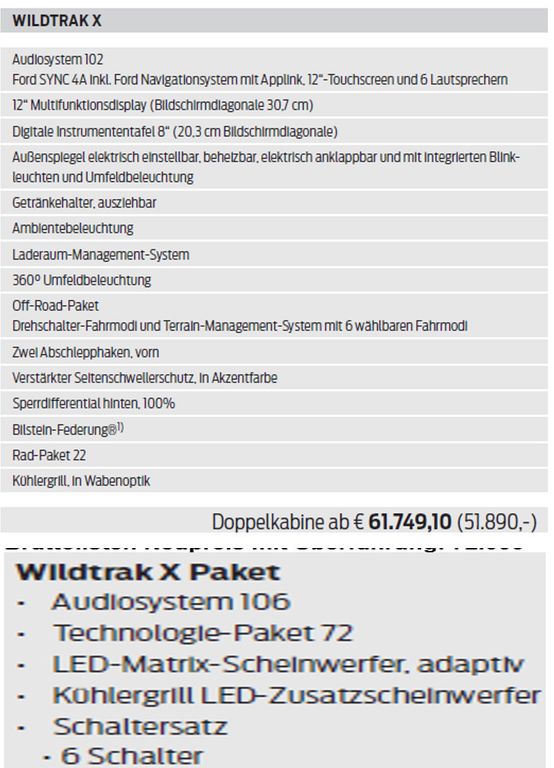 Подробный расчёт Ford Wildtrak X Tech83 eRollo B+O AHK3,5t Np70t LAGER