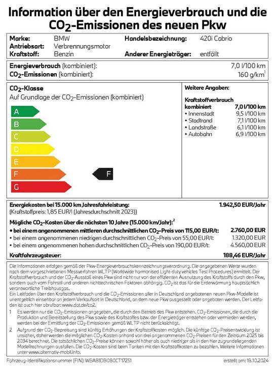 Подробный расчёт BMW 420i Cabrio M Sportpaket *Vorführwagen-Aktion*